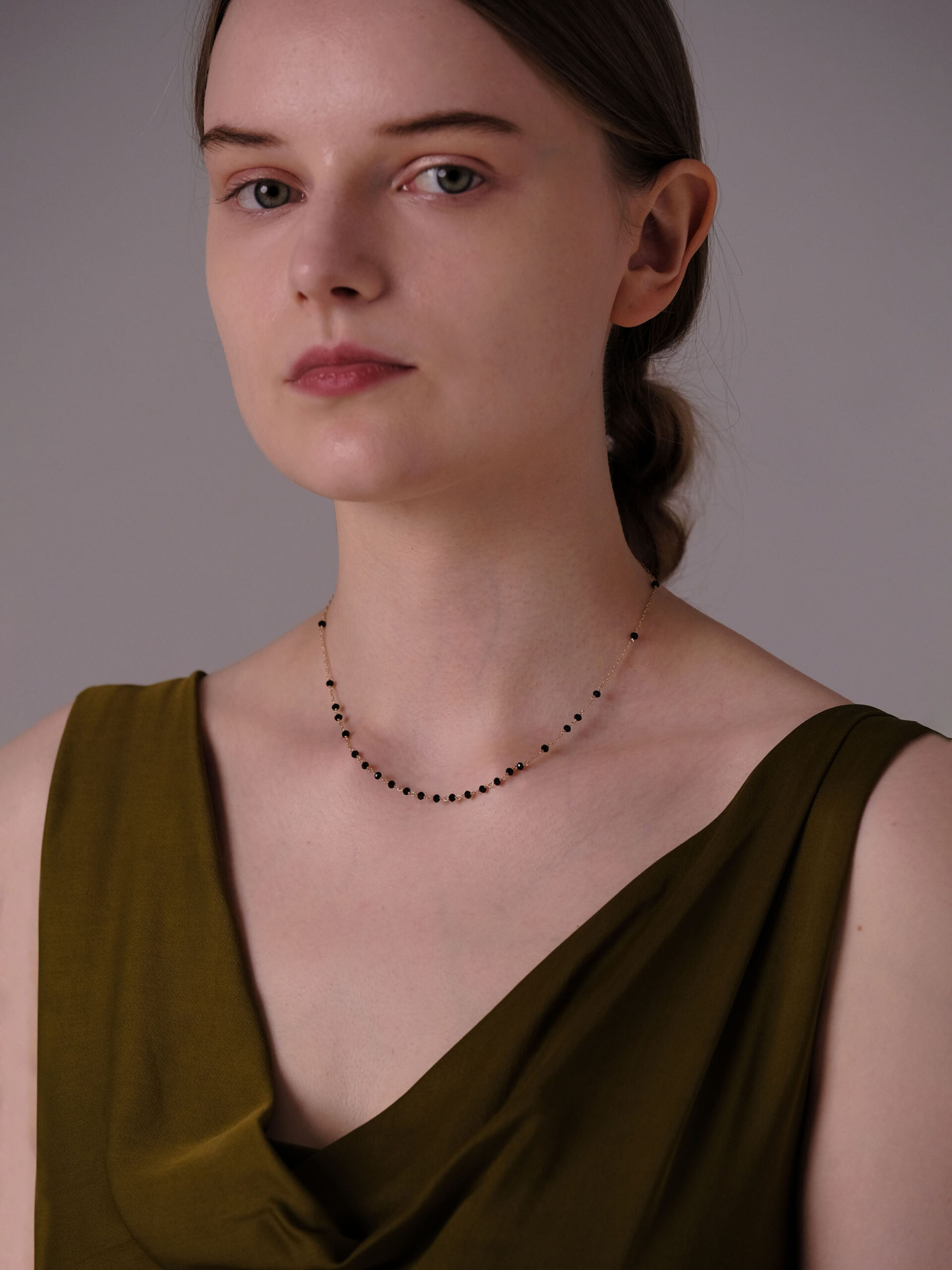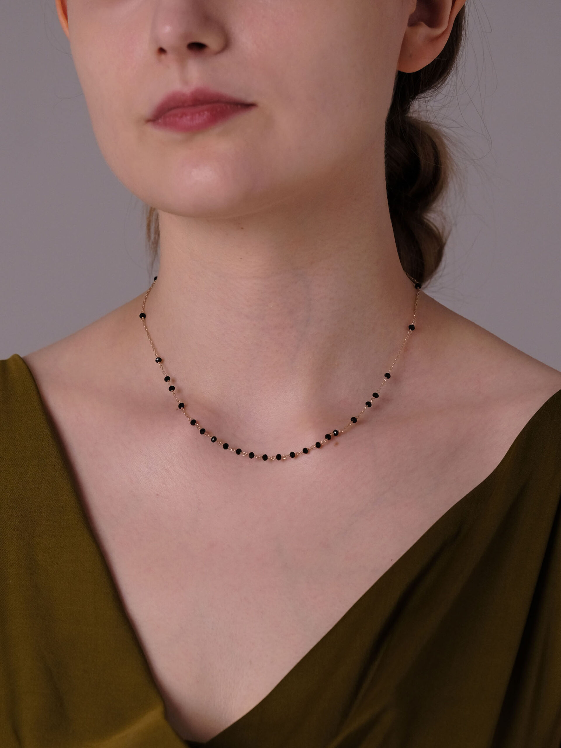小粒のブラックスピネルを繊細なチェーンとリズムよく繋げ仕立てたショートネックレス。