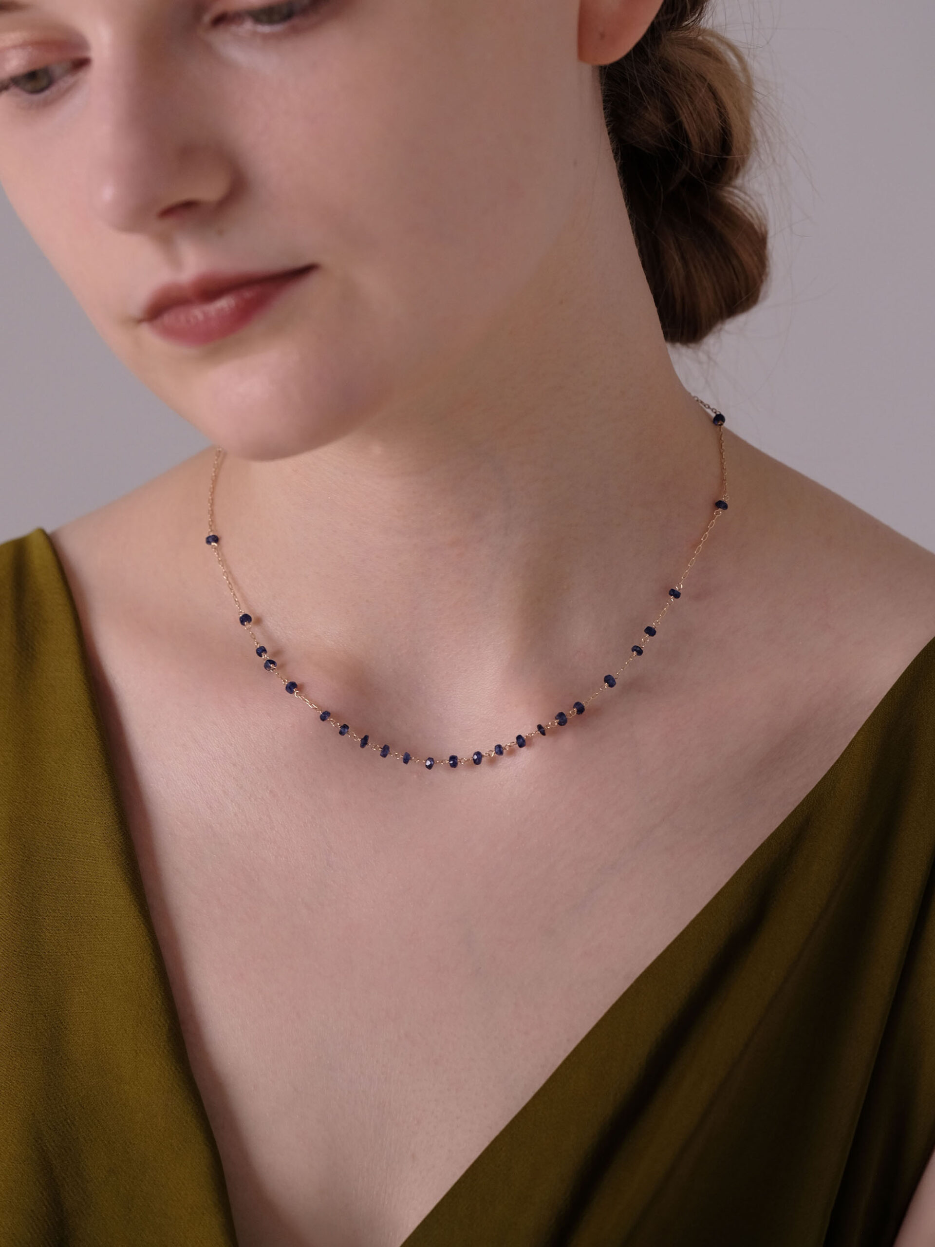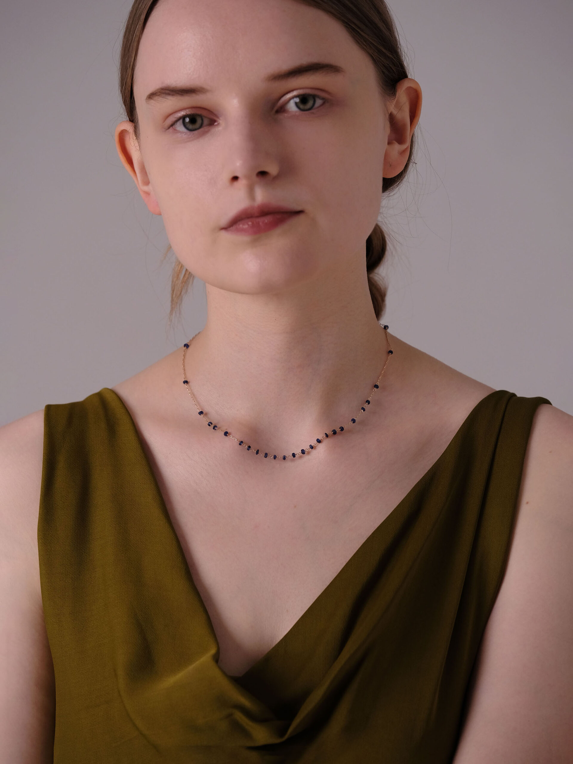 小粒のブルーサファイアを繊細なチェーンとリズムよく繋げ仕立てたショートネックレス。