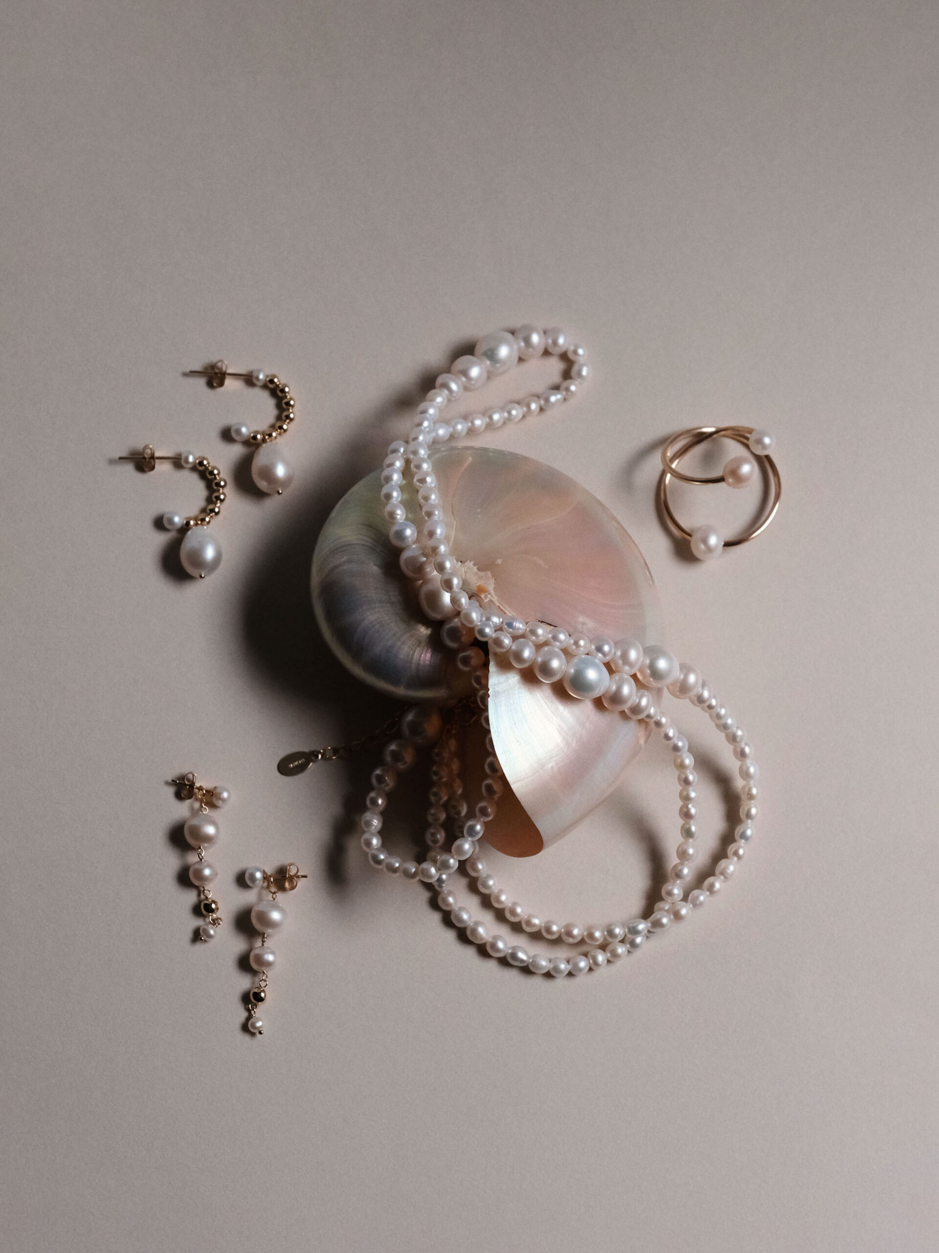 パールの大きさをグラデーションに配置し、太さに強弱をつけたネックレス。