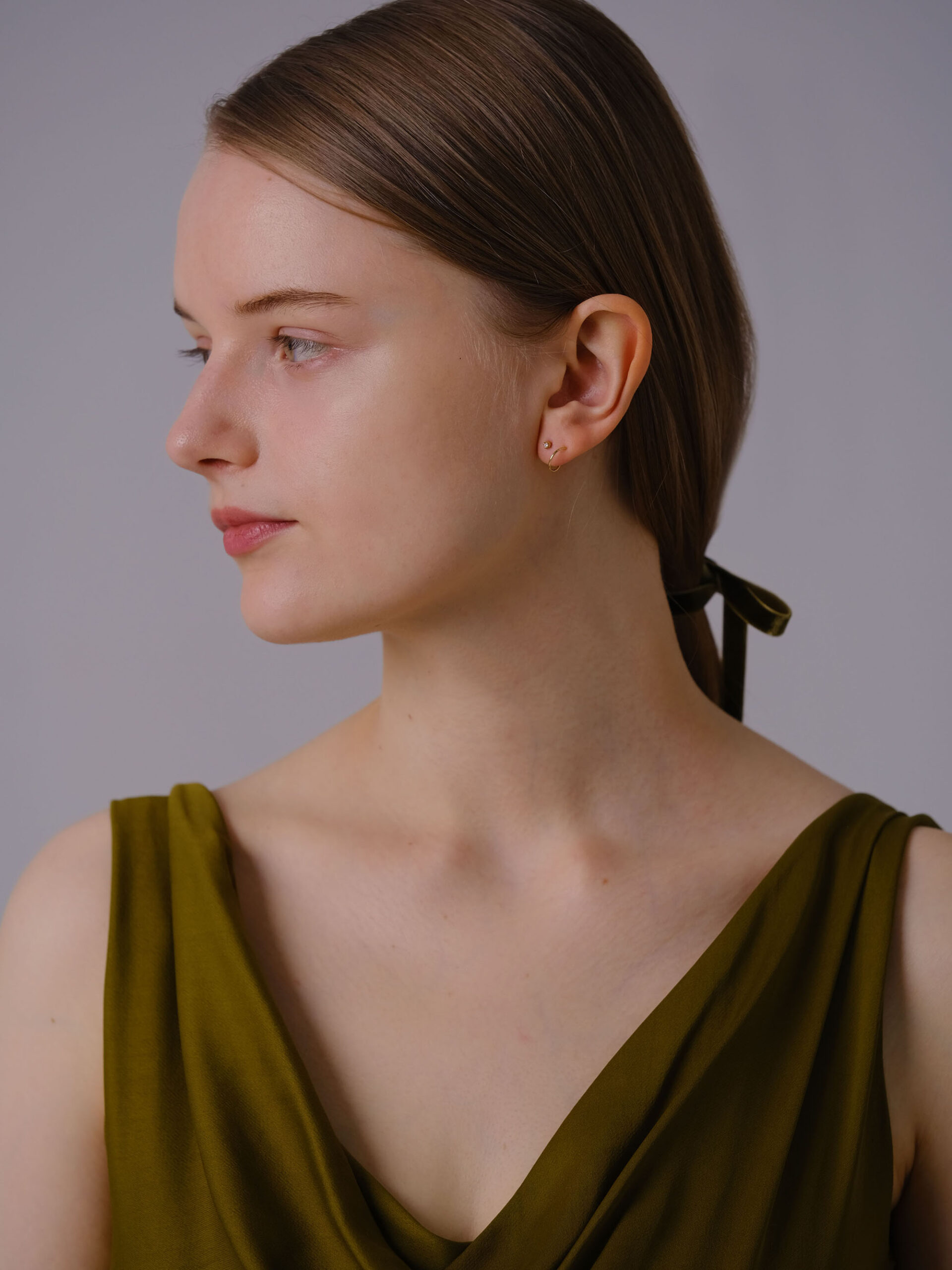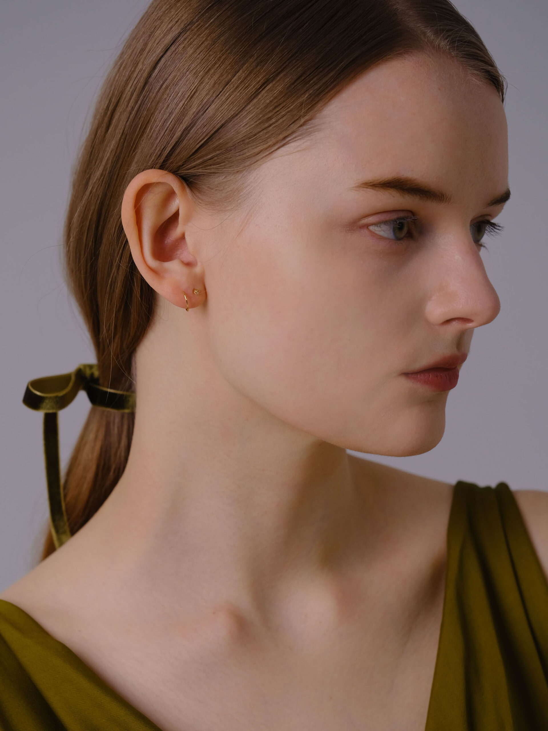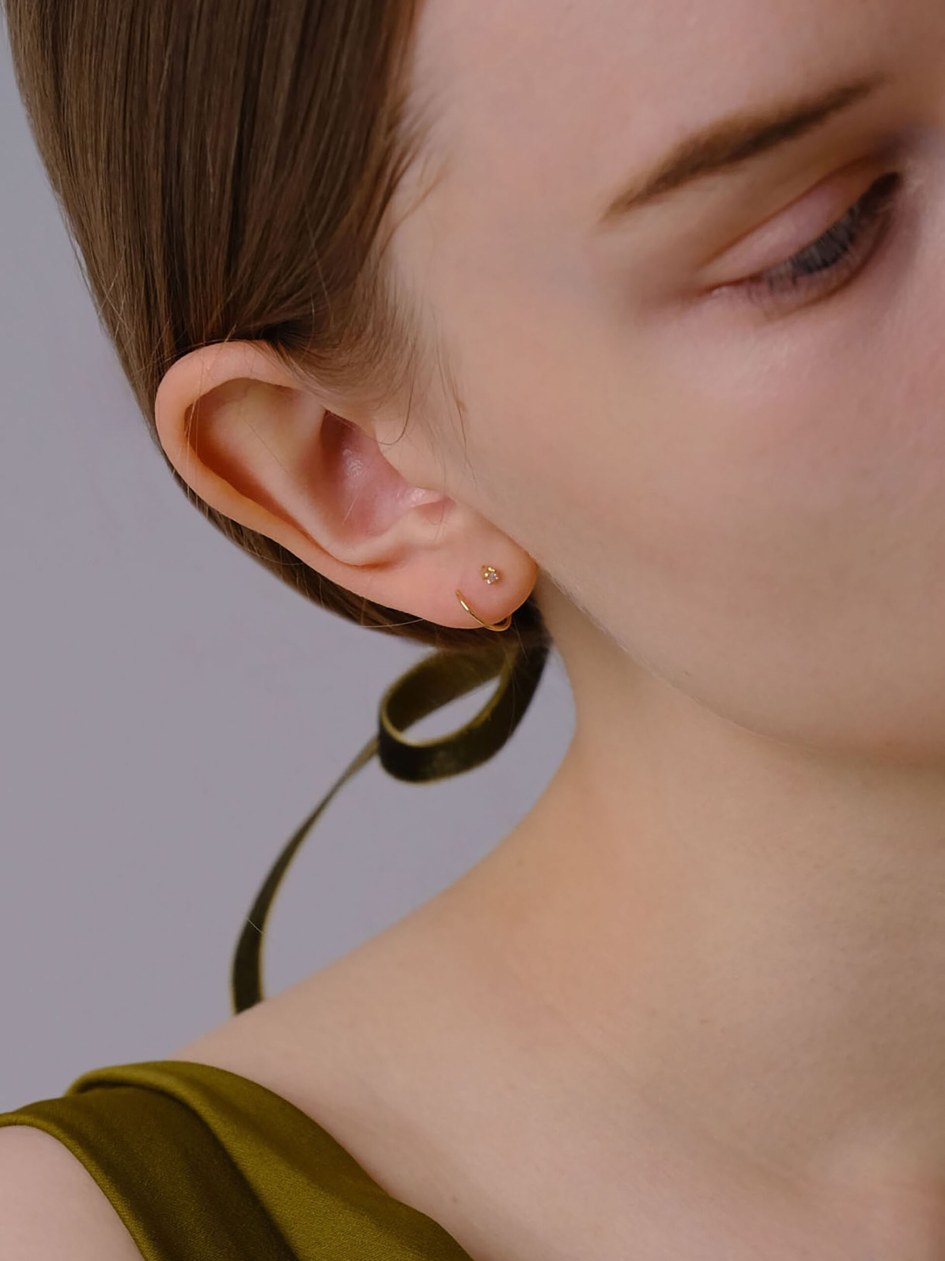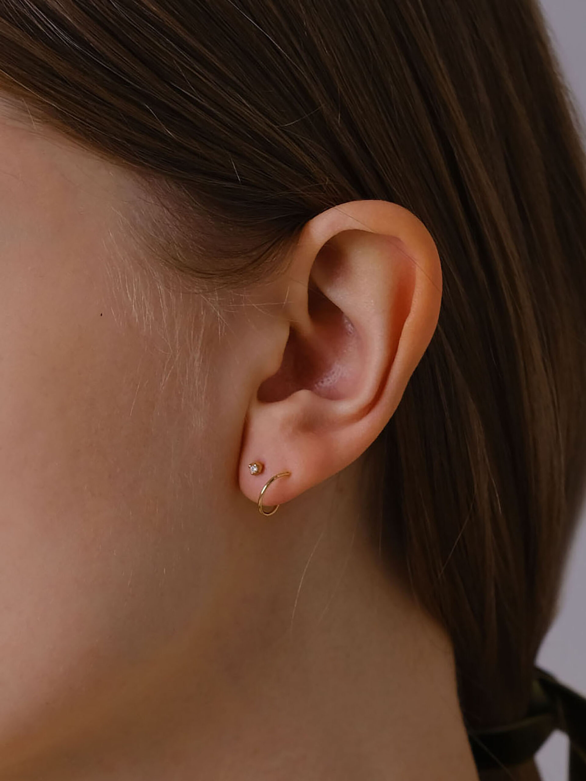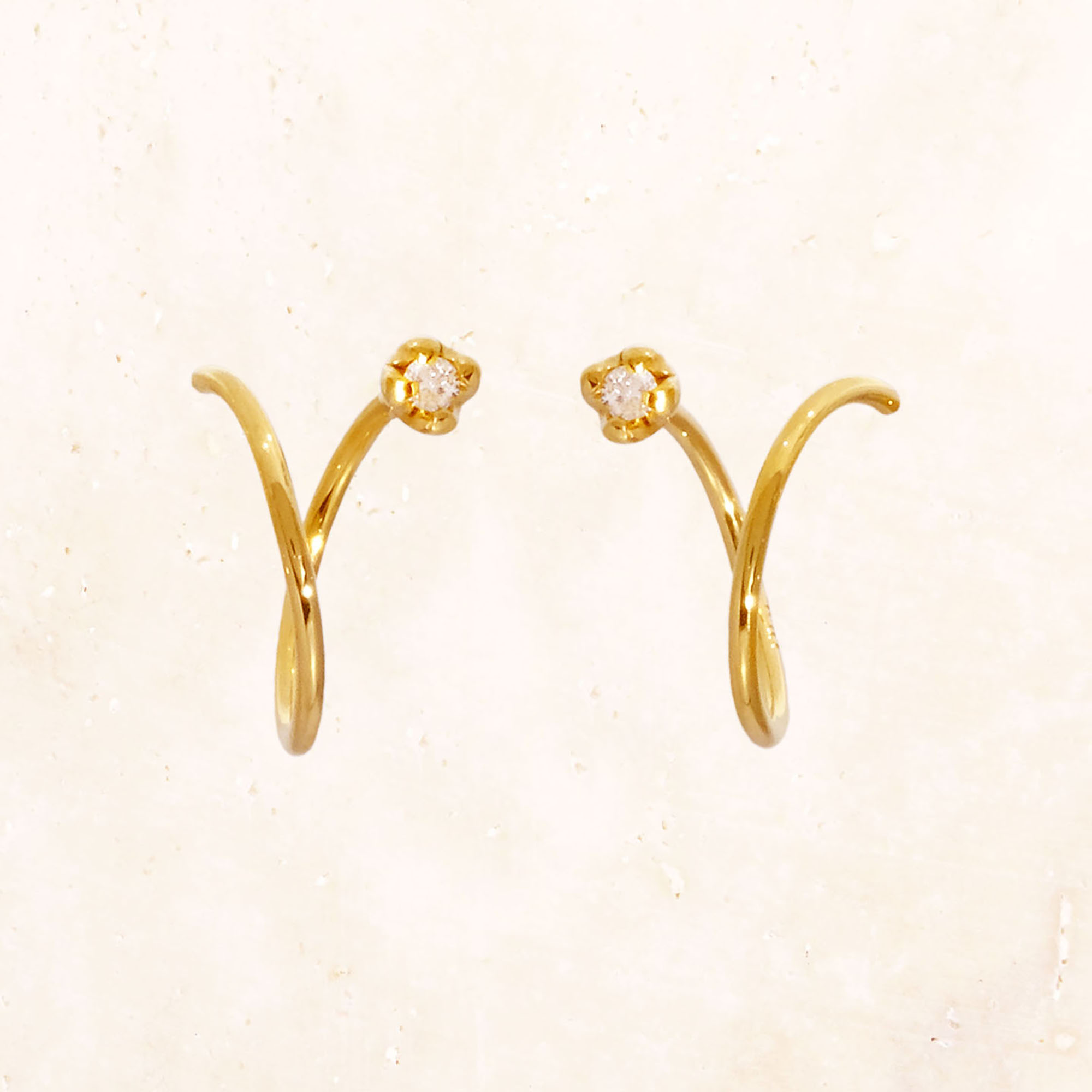 螺旋状のピアスポストをくるくると引き込むことで、ダイヤモンドのスタッドピアス+ゴールドのフープピアスの2本を着けているように見えるアイテム。