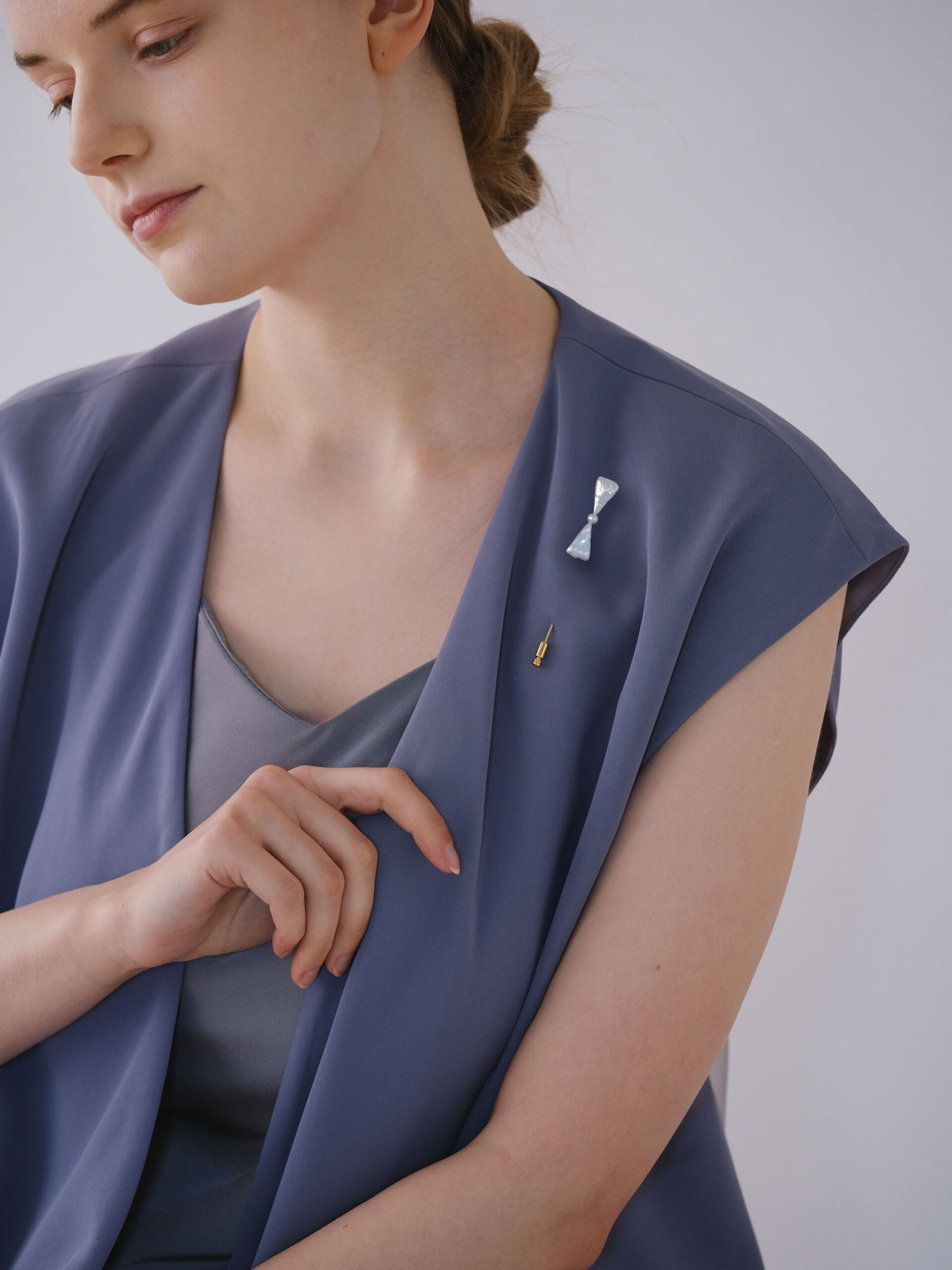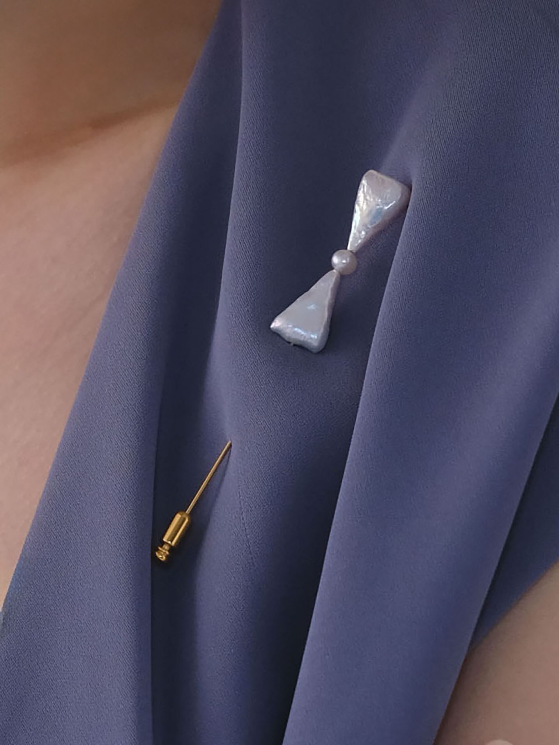 珍しい三角形の淡水パールを組み合わせ、リボンのようなフォルムに仕立てたラペルピンブローチ。フォーマルな装いに、親しみやすさとさりげない愛らしさを添える、遊び心のあるデザインです。胸元につけるブローチとしてははもちろん、ジャケットのラペルやストール留め、帽子やバッグのアクセントとしても活躍します。