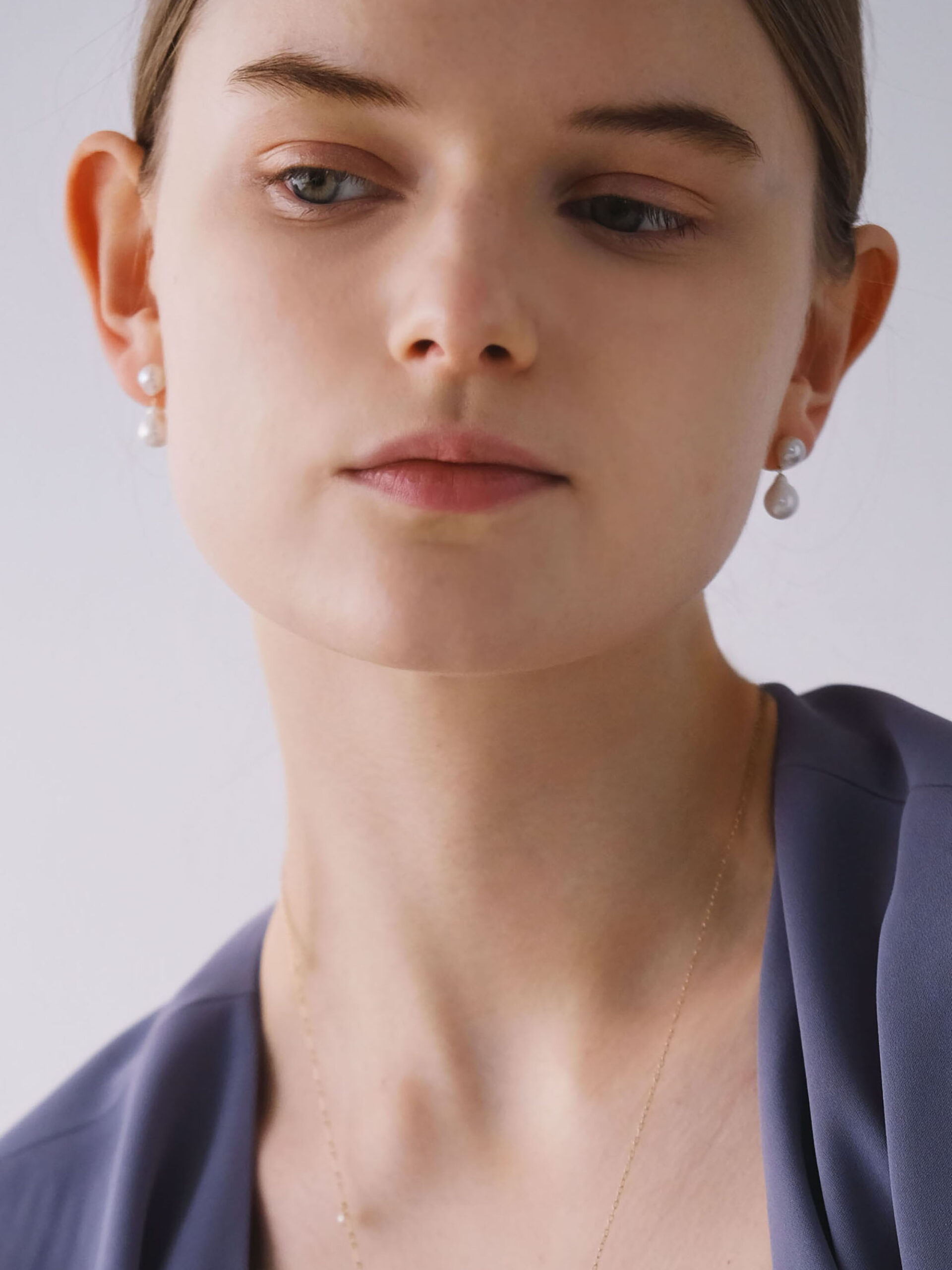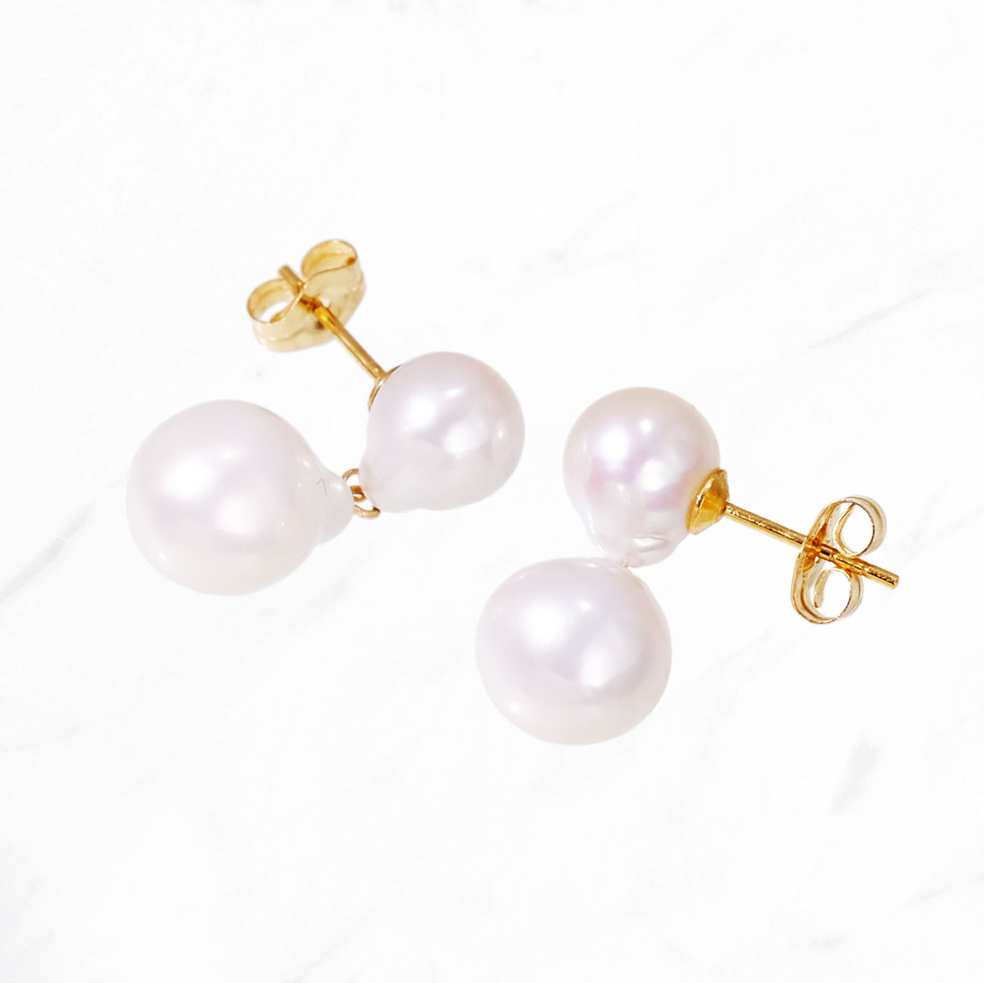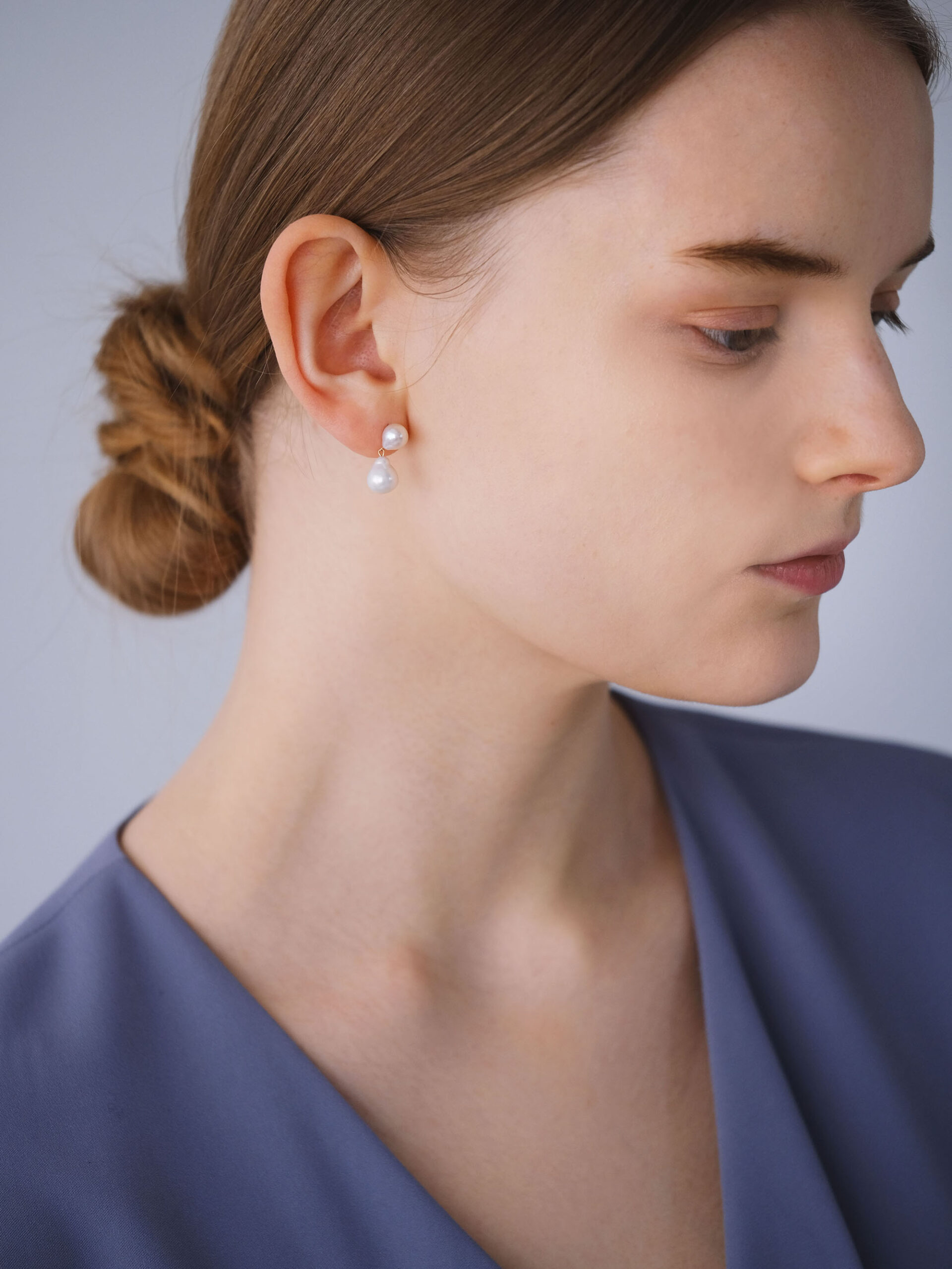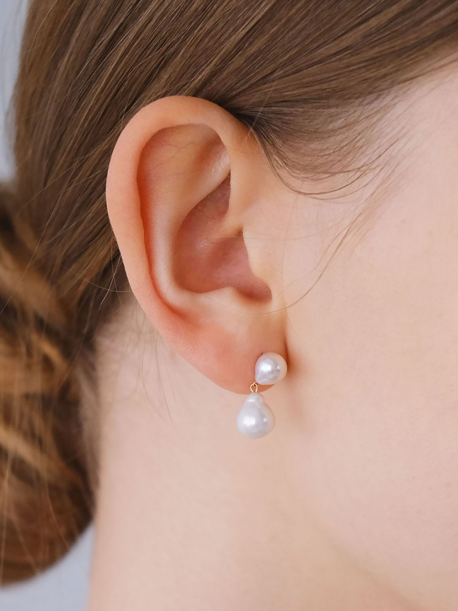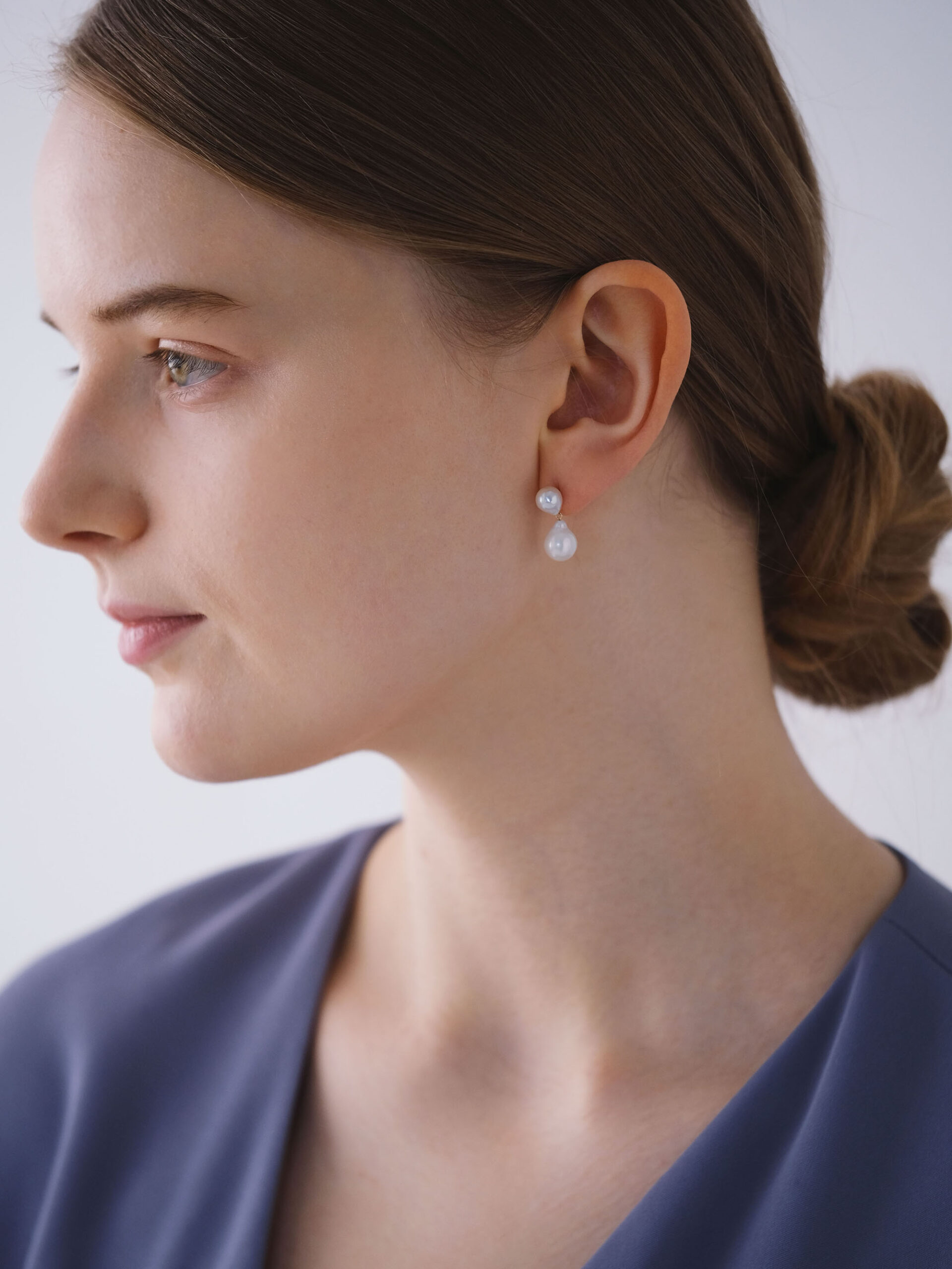 ほんのりとしずくシェイプの、ふたつの淡水パールを双子のように寄り添わせたピアス。パール同士の間隔をきゅっと詰めたコンパクトなサイズ感が、耳元にさりげない存在感を添えます。動くたびに小刻みに揺れる軽やかさは、スタッズピアスの品のよさと、揺れ感のあるピアスの魅力をいいとこ取り。ベーシックなパールのスタッドピアスよりあと少し華やかさが欲しい時にピッタリのアイテムです。