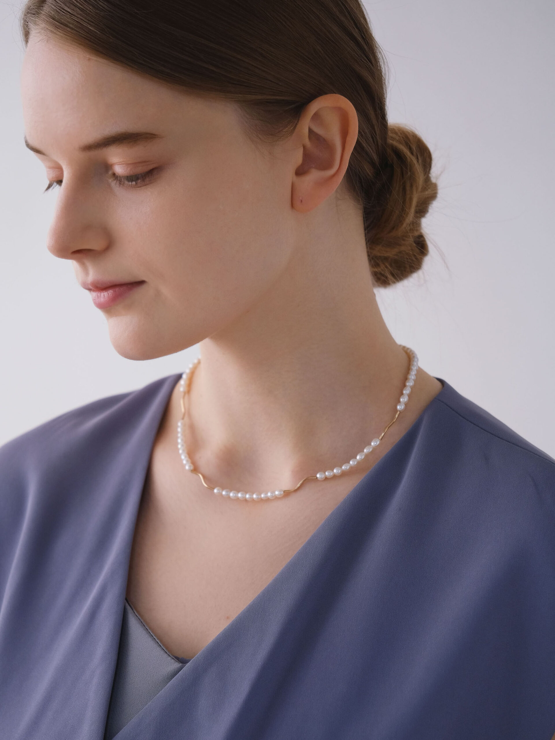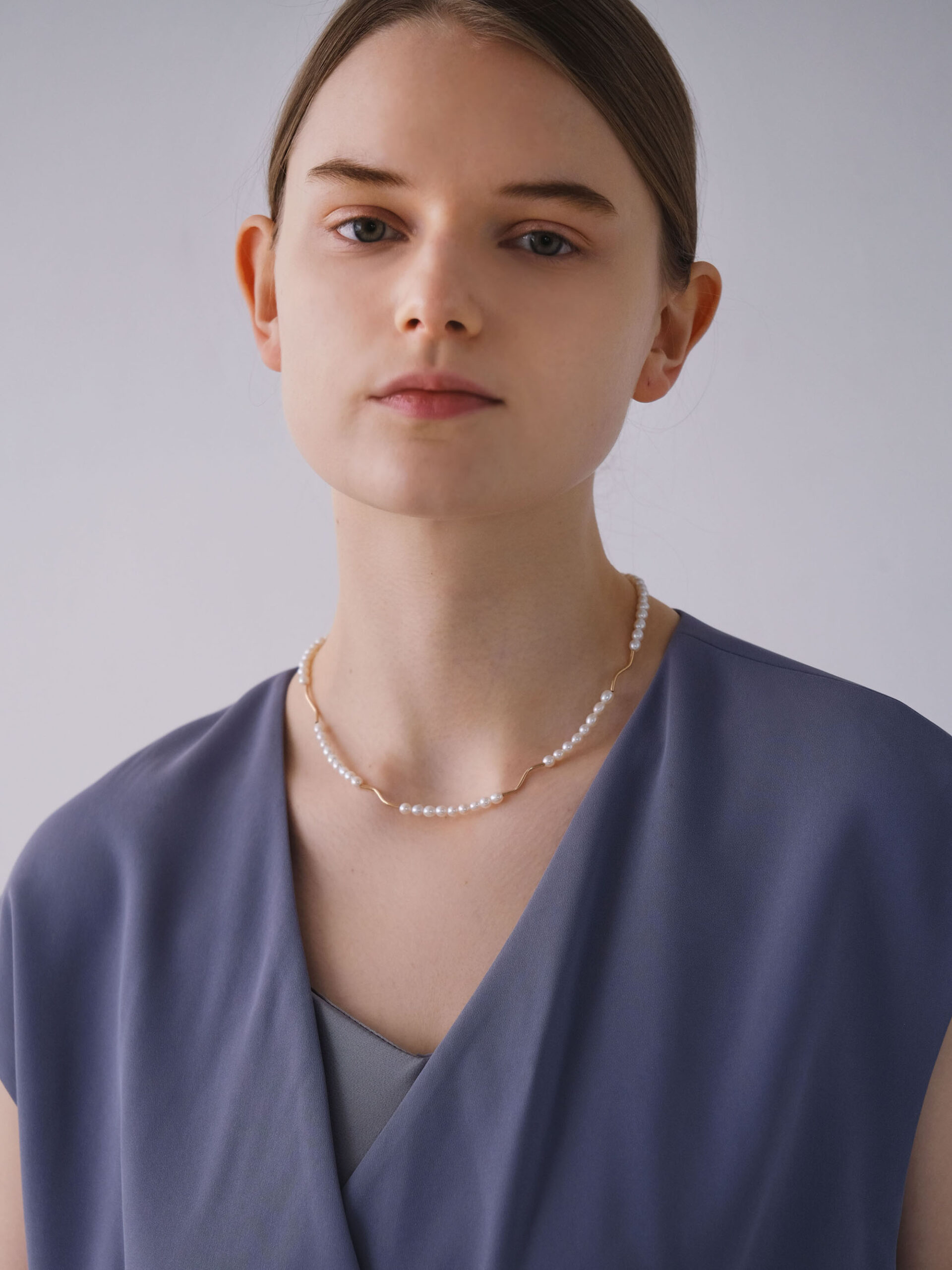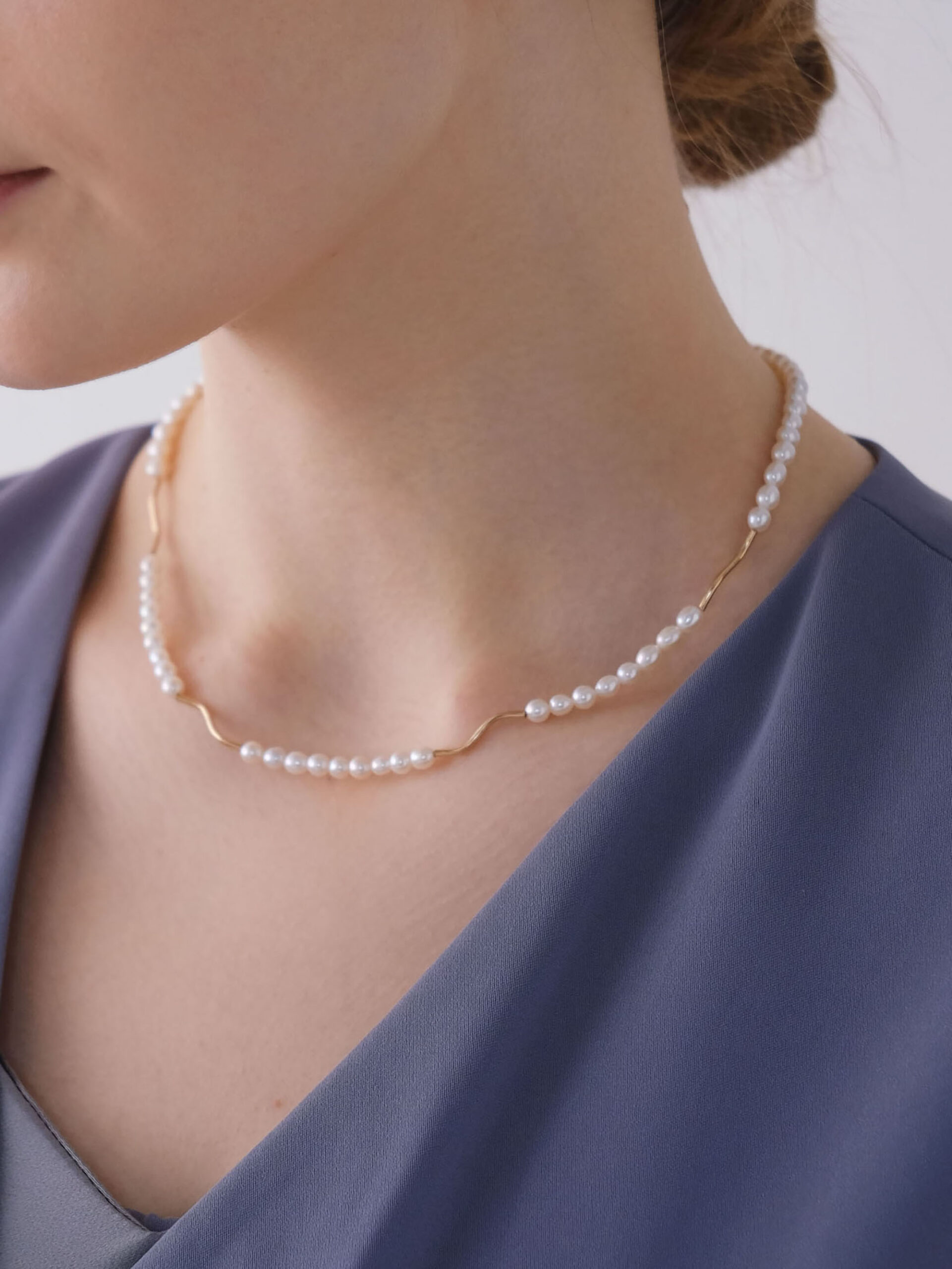 パールの連なりに、なめらかなメタルのウェーブラインを忍ばせたネックレス。ベーシックなパールネックレスにモダンでエレガントなアクセントを添えることで、装い全体をさりげなく今の空気へと導きます。主張しすぎることなく、それでいて確かな存在感。日常使いでも気負いなく取り入れられ、きちんとした場面にも美しく映える、絶妙なバランス感覚が魅力です。